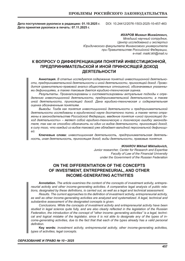 Ихаров, М.М. К вопросу о дифференциации понятий инвестиционной, предпринимательской и иной приносящей доход деятельности // Образование и право. – 2025. – № 10. — С. 457-463. — Только в электронном виде. — <URL:http://elib.fa.ru/art2025/bv2226.pdf>.