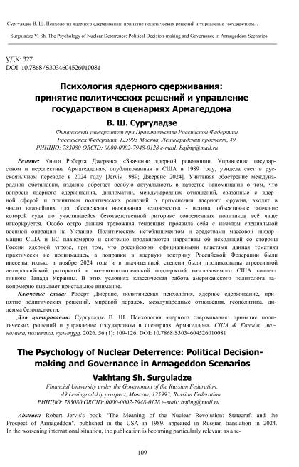 Сургуладзе, В.Ш. Психология ядерного сдерживания: принятие политических решений и управление государством в сценариях Армагеддона // США. Канада.Экономика - политика - культура. – 2026. – № 1. — С. 109-126 — <URL:http://elib.fa.ru/art2026/bv20.pdf>.