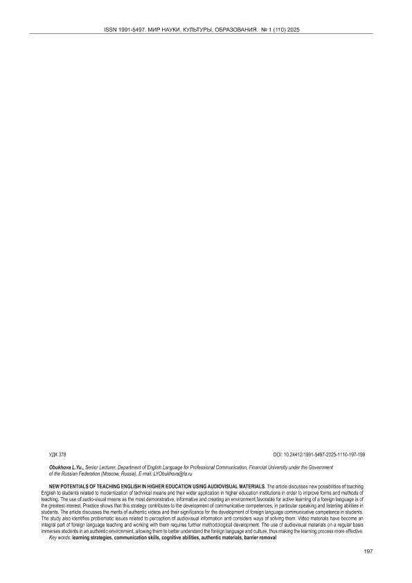 Обухова, Л.Ю. Новые возможности преподавания английского языка в вузе с помощью аудиовизуальных материалов // Мир науки, культуры, образования. – 2025. – № 1. — С. 197-199. — Только в электронном виде. — <URL:http://elib.fa.ru/art2025/bv1384.pdf>.