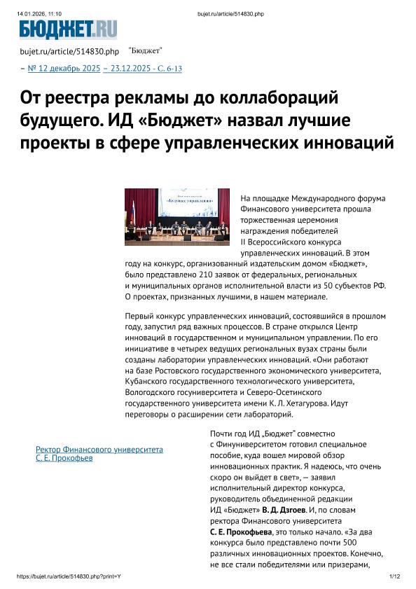 Ольховая, А.Ю. От реестра рекламы до коллабораций будущего. ИД «Бюджет» назвал лучшие проекты в сфере управленческих инноваций // Журнал Бюджет. – 2025. – № 12. — С. 6-13 — <URL:http://elib.fa.ru/art2025/bv1385.pdf>.