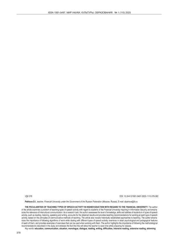 Пехова, Д.И. Особенности обучения видам речевой деятельности в высшей школе на примере студентов Финуниверситета // Мир науки, культуры, образования. – 2025. – № 1. — С. 378-382. — Только в электронном виде. — <URL:http://elib.fa.ru/art2025/bv1386.pdf>.