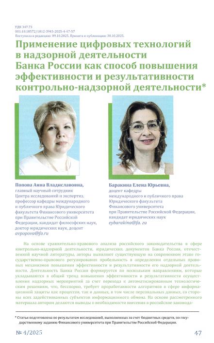 Попова, А.В. Применение цифровых технологий в надзорной деятельности Банка России как способ повышения эффективности и результативности контрольно-надзорной деятельности / А.В. Попова, Е.Ю. Баракина // Банковское право. – 2025. – № 4. — С. 47-57. — Хранение – Щербаковская, 38. — <URL:http://elib.fa.ru/art2025/bv1387.pdf>.