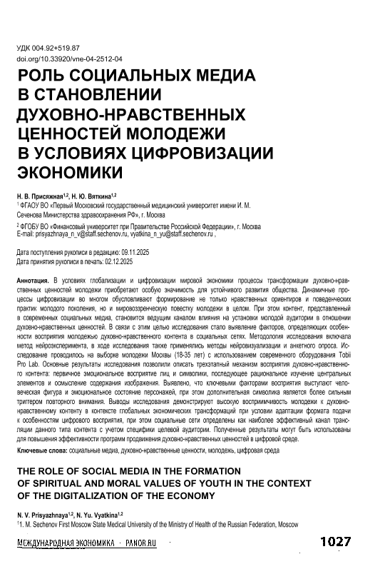 Присяжная, Н.В. Роль социальных медиа в становлении духовно-нравственных ценностей молодежи в условиях цифровизации экономики / Н.В. Присяжная, Н.Ю. Вяткина // Международная экономика. – 2025. – № 12. — С. 1027-1045 — <URL:http://elib.fa.ru/art2025/bv1388.pdf>.