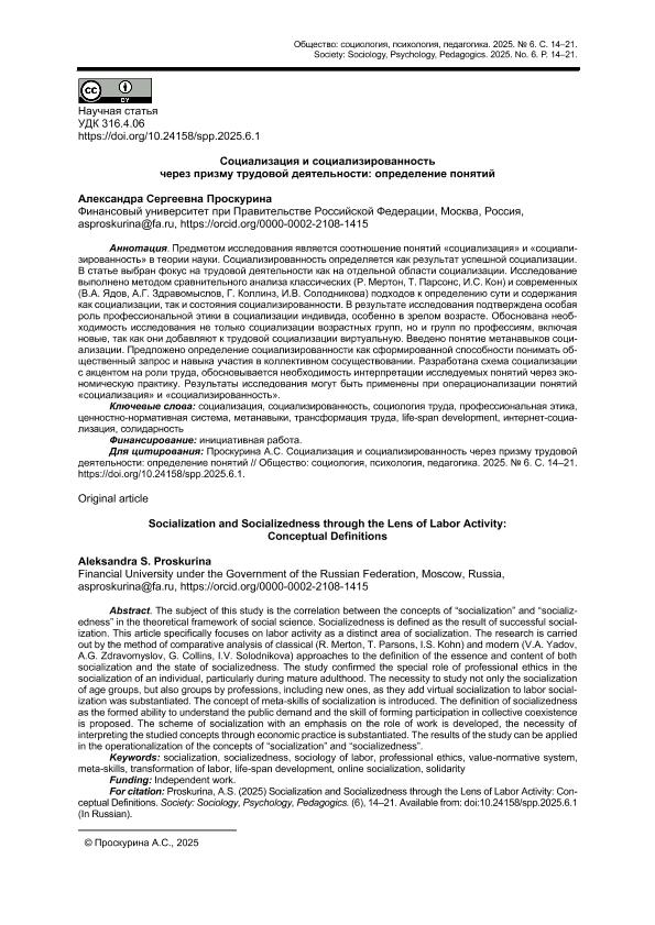 Проскурина, А.С. Социализация и социализированность через призму трудовой деятельности: определение понятий // Общество: социология, психология, педагогика. – 2025. – № 6. — С. 14-21. — Только в электронном виде. — <URL:http://elib.fa.ru/art2025/bv1389.pdf>.