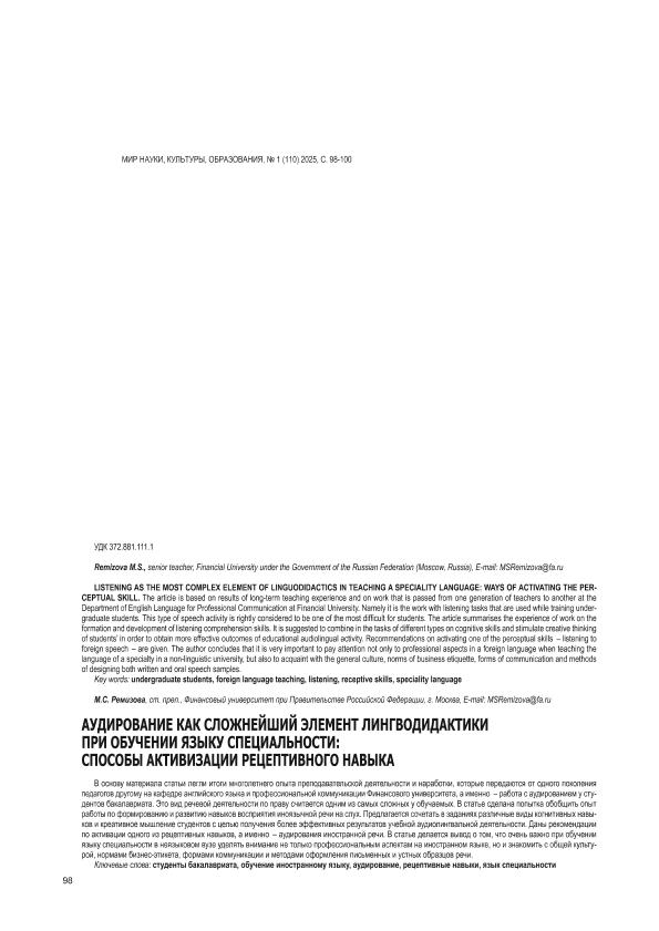 Ремизова, М.С. Аудирование как сложнейший элемент лингводидактики при обучении языку специальности: способы активизации рецептивного навыка // Мир науки, культуры, образования. – 2025. – № 1. — С. 98-100. — Только в электронном виде. — <URL:http://elib.fa.ru/art2025/bv1390.pdf>.