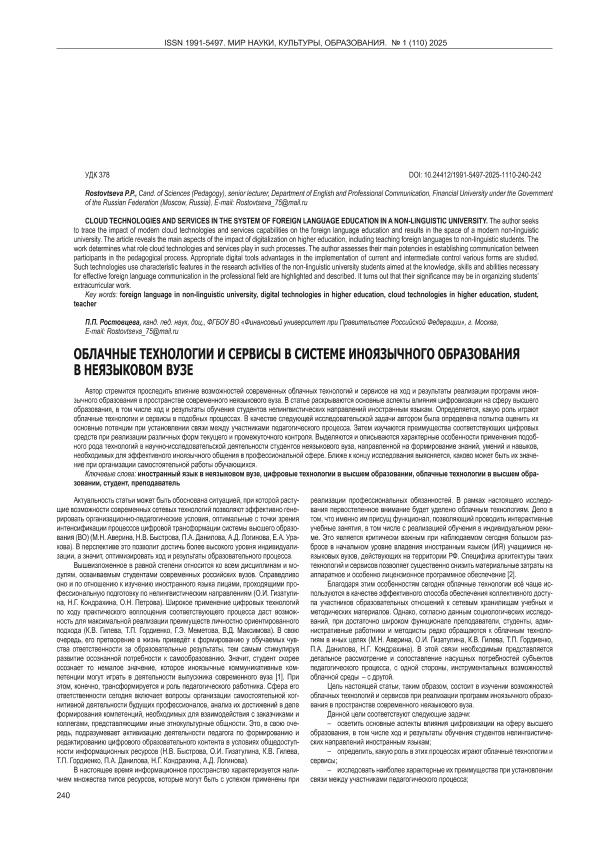 Ремизова, П.П. Облачные технологии и сервисы в системе иноязычного образования в неязыковом вузе // Мир науки, культуры, образования. – 2025. – № 1. — С. 240-242. — Только в электронном виде. — <URL:http://elib.fa.ru/art2025/bv1391.pdf>.