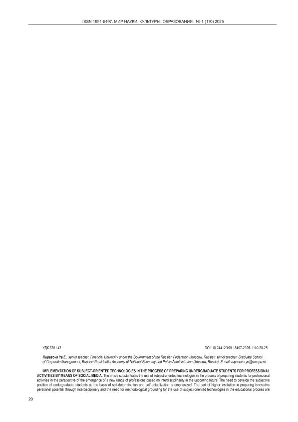 Рупасова, Я.Е. Реализация субъектно-ориентированных технологий в процессе подготовки студентов бакалавриата к профессиональной деятельности средствами социальных медиа // Мир науки, культуры, образования. – 2025. – № 1. — С. 20-25. — Только в электронном виде. — <URL:http://elib.fa.ru/art2025/bv1392.pdf>.
