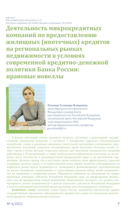 недвижимости в условиях современной кредитно-денежной политики Банка России: правовые новеллы // Банковское право. – 2025. – № 4. — С. 7-13. — Хранение – Щербаковская, 38. — <URL:http://elib.fa.ru/art2025/bv1393.pdf>.