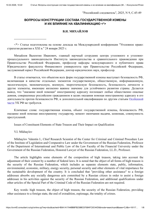 Михайлов, В.И. Вопросы конструкции состава государственной измены и их влияние на квалификацию // Российский следователь. – 2025. – № 9. — С. 45-49. — Только в электронном виде. — <URL:http://elib.fa.ru/art2025/bv1974.pdf>.