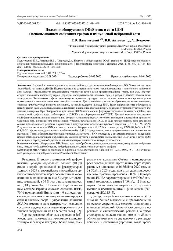 Пальчевский, Е.В. Подход к обнаружению DDoS-атак в сети ЦОД с использованием сочетания графов и импульсной нейронной сети / Е.В. Пальчевский, В.В. Антонов, Д.А. Петросов // Программные продукты и системы. – 2025. – № 3. — С. 484-498. — Только в электронном виде. — <URL:http://elib.fa.ru/art2025/bv1977.pdf>.