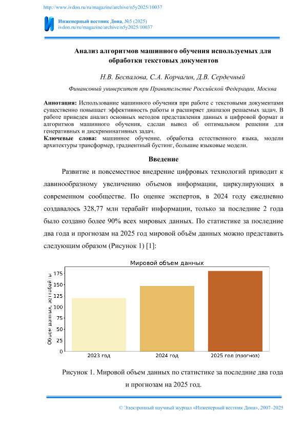 Беспалова, Н.В. Анализ алгоритмов машинного обучения используемых для обработки текстовых документов / Н.В. Беспалова, С.А. Корчагин, Д.В. Сердечный. — Текст: электронный // Инженерный вестник Дона. – 2025. – № 5. — URL: http://www.ivdon.ru/ru/magazine/archive/n5y2025/10037. - Дата публикации: 25.04.2025 — <URL:http://elib.fa.ru/art2025/bv2050.pdf>.