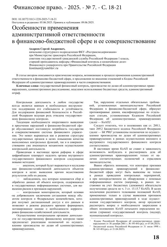 Андреев, С.А. Особенности применения административной ответственности в финансово-бюджетной сфере и ее совершенствование // Финансовое право. – 2025. – № 7. — С. 18-21. — Хранение – Щербаковская, 38. — <URL:http://elib.fa.ru/art2025/bv334.pdf>.