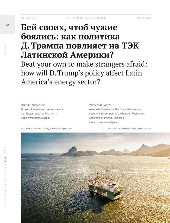 Андрианов, В. Бей своих, чтоб чужие боялись: как политика Д. Трампа повлияет на ТЭК Латинской Америки? // Энергетическая политика. – 2025. – № 1. — C. 42-57. — Только в электронном виде. — <URL:http://elib.fa.ru/art2025/bv336.pdf>.