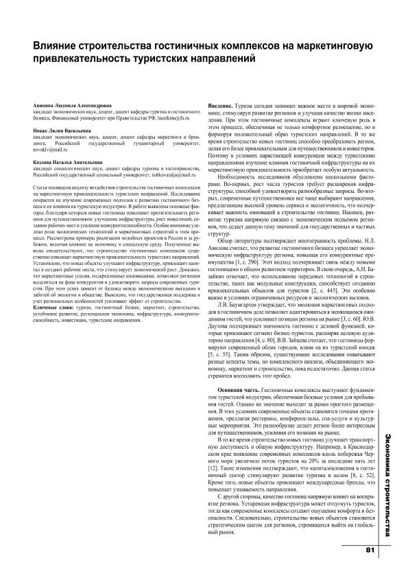 привлекательность туристских направлений / Л.А. Аникина, Л.В. Новак, Н.А. Козлова // Экономика строительства. – 2025. – № 3. — С. 81-84. — Только в электронном виде. — <URL:http://elib.fa.ru/art2025/bv337.pdf>.