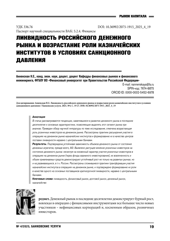 Анненская, Н.Е. Ликвидность российского денежного рынка и возрастание роли казначейских институтов в условиях санкционного давления // Банковские услуги. – 2025. – № 4. — С. 19-27. — Только в электронном виде. — <URL:http://elib.fa.ru/art2025/bv338.pdf>.