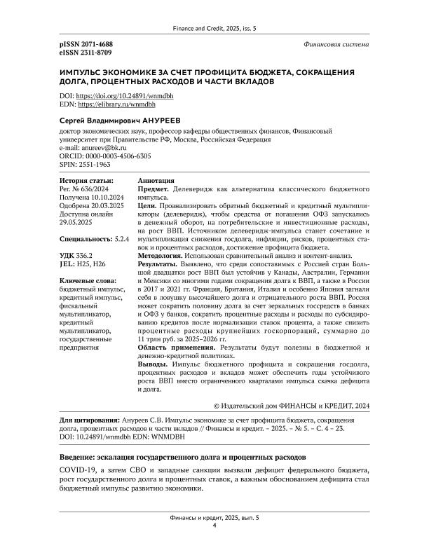 Ануреев, С.В. Импульс экономике за счет профицита бюджета, сокращения долга, процентных расходов и части вкладов // Финансы и кредит. – 2025. – № 5. — С. 4-23. — Только в электронном виде. — <URL:http://elib.fa.ru/art2025/bv339.pdf>.