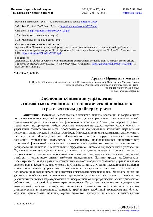 Арехина, И.А. Эволюция концепций управления стоимостью компании: от экономической прибыли к стратегическим драйверам роста. — Текст: электронный // Вестник Евразийской науки. – 2025. – № s1. — URL: https://esj.today/PDF/60FAVN125.pdf (дата обращения: 17.09.2025) — <URL:http://elib.fa.ru/art2025/bv340.pdf>.