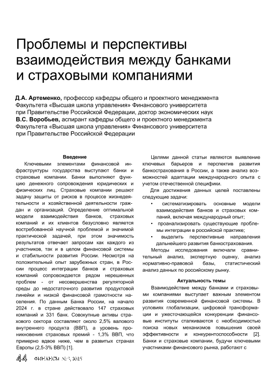 Артеменко, Д.А. Проблемы и перспективы взаимодействия между банками и страховыми компаниями / Д.А. Артеменко, В.С. Воробьев // Финансы. – 2025. – № 9. — С. 44-51 — <URL:http://elib.fa.ru/art2025/bv341.pdf>.