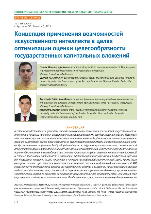 Арутюнов, Г.Ю. Концепция применения возможностей искусственного интеллекта в целях оптимизации оценки целесообразности государственных капитальных вложений / Г.Ю. Арутюнов, А.С. Вагнер // Научные записки молодых исследователей. – 2025. – № 3. — С. 62-73 — <URL:http://elib.fa.ru/art2025/bv342.pdf>.