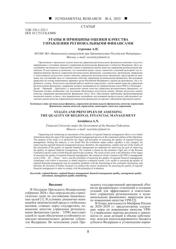 Атрохова, А.Н. Этапы и принципы оценки качества управления региональными финансами // Фундаментальные исследования. – 2025. – № 4. — С. 8-13. — Только в электронном виде. — <URL:http://elib.fa.ru/art2025/bv343.pdf>.