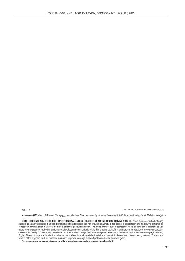 Ачкасова, Н.Н. Использование студентов как ресурса на занятиях по профессиональному английскому языку в неязыковом вузе // Мир науки, культуры, образования. – 2025. – № 2. — С. 175-178. — Только в электронном виде. — <URL:http://elib.fa.ru/art2025/bv1485.pdf>.