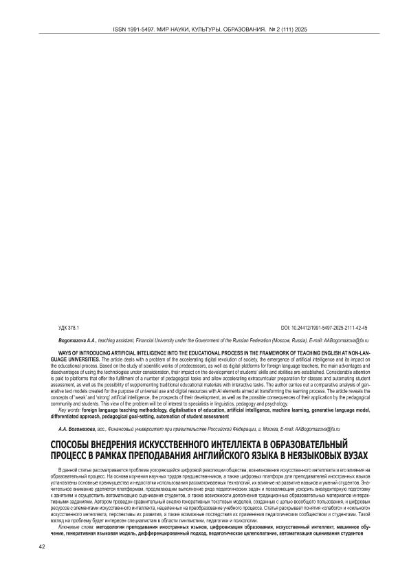 Богомазова, А.А. Способы внедрения искусственного интеллекта в образовательный процесс в рамках преподавания английского языка в неязыковых вузах // Мир науки, культуры, образования. – 2025. – № 2. — С. 42-45. — Только в электронном виде. — <URL:http://elib.fa.ru/art2025/bv1486.pdf>.
