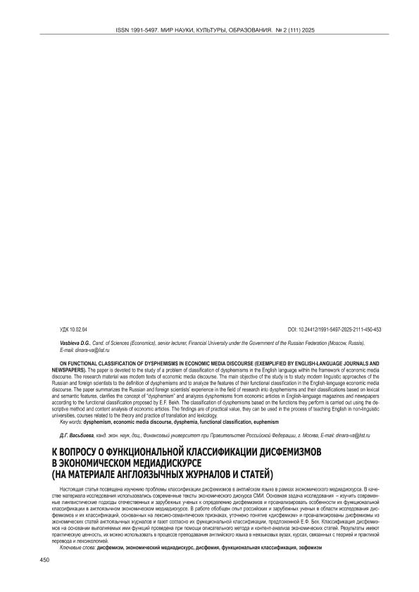 Васьбиева, Д.Г. К вопросу о функциональной классификации дисфемизмов в экономическом медиадискурсе (на материале англоязычных журналов и статей) // Мир науки, культуры, образования. – 2025. – № 2. — С. 450-453. — Только в электронном виде. — <URL:http://elib.fa.ru/art2025/bv1487.pdf>.