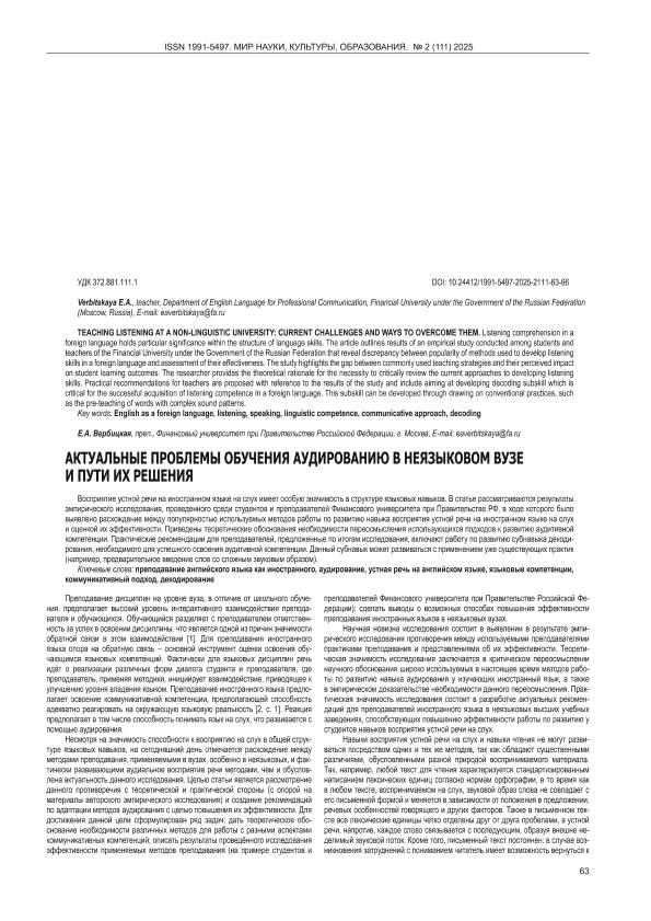 Вербицкая, Е.А. Актуальные проблемы обучения аудированию в неязыковом вузе и пути их решения // Мир науки, культуры, образования. – 2025. – № 2. — С. 63-66. — Только в электронном виде. — <URL:http://elib.fa.ru/art2025/bv1488.pdf>.