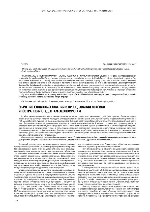 Гиловая, Е.А. Значение словообразования в преподавании лексики иностранным студентам-экономистам // Мир науки, культуры, образования. – 2025. – № 2. — С. 120-122. — Только в электронном виде. — <URL:http://elib.fa.ru/art2025/bv1489.pdf>.