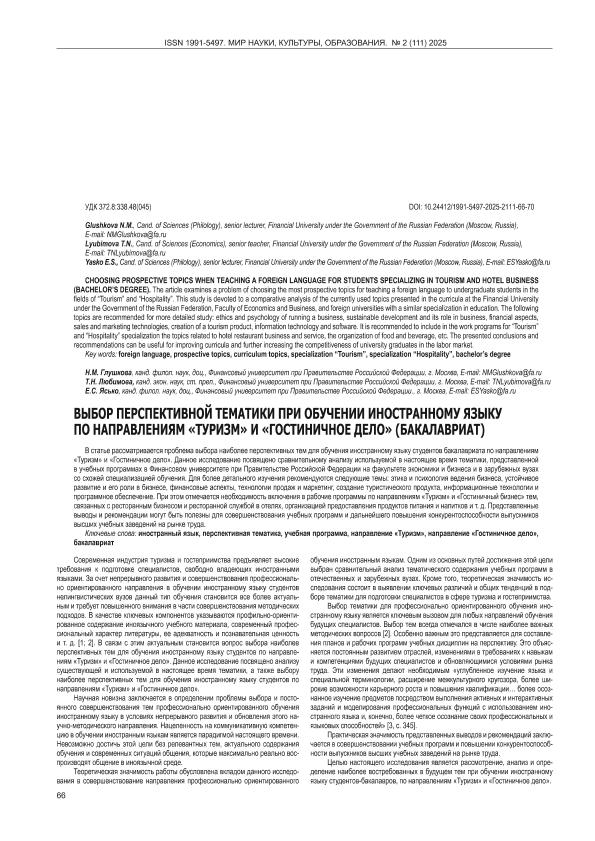 Глушкова, Н.М. Выбор перспективной тематики при обучении иностранному языку по направлениям «Туризм» и «Гостиничное дело» (бакалавриат) / Н.М. Глушкова, Т.Н. Любимова, Е.С. Ясько // Мир науки, культуры, образования. – 2025. – № 2. — С. 66-70. — Только в электронном виде. — <URL:http://elib.fa.ru/art2025/bv1490.pdf>.