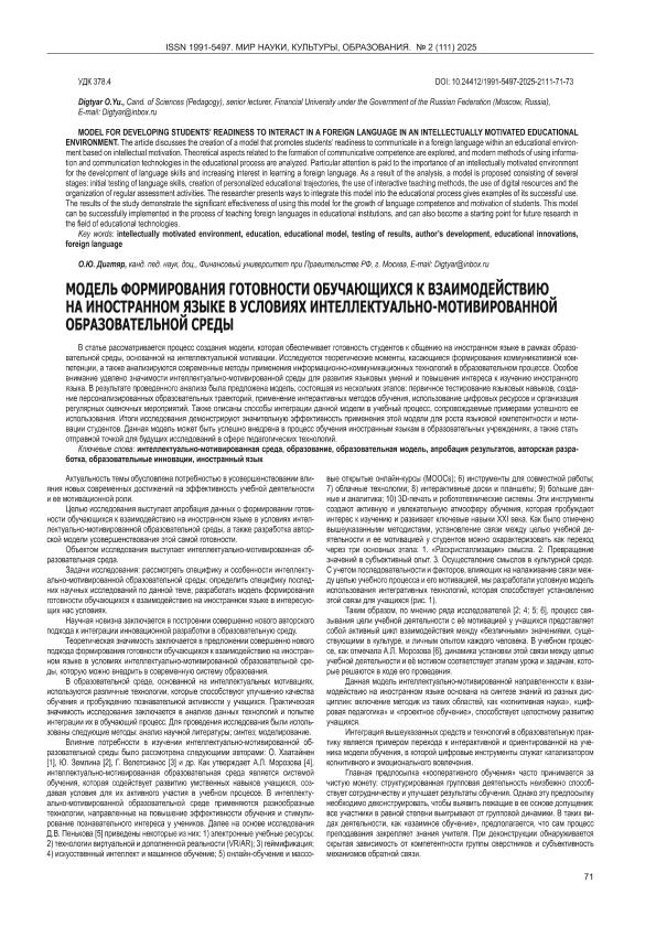 Дигтяр, О.Ю. Модель формирования готовности обучающихся к взаимодействию на иностранном языке в условиях интеллектуально-мотивированной образовательной среды // Мир науки, культуры, образования. – 2025. – № 2. — С. 71-73. — Только в электронном виде. — <URL:http://elib.fa.ru/art2025/bv1491.pdf>.