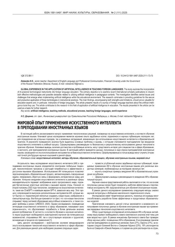 Доценко, Н.С. Мировой опыт применения искусственного интеллекта в преподавании иностранных языков // Мир науки, культуры, образования. – 2025. – № 2. — С. 73-75. — Только в электронном виде. — <URL:http://elib.fa.ru/art2025/bv1492.pdf>.