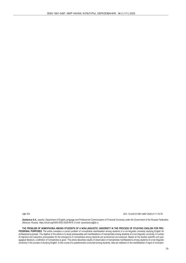 Золотарева, С.А. Проблема номофобии у студентов неязыкового вуза в процессе изучения английского языка для профессиональных целей // Мир науки, культуры, образования. – 2025. – № 2. — С. 75-78. — Только в электронном виде. — <URL:http://elib.fa.ru/art2025/bv1493.pdf>.