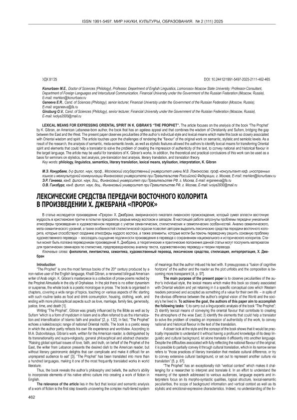 Konurbaev M.E. (Конурбаев М.Е.). Lexical Means for Expressing Oriental Spirit in K. Gibran’s «The Prophet» = Лексические средства передачи восточного колорита в произведении Х. Джебрана «Пророк» / Konurbaev M.E. (Конурбаев М.Е.), Ganeeva E.R. (Ганеева Э.Р.), Ginzburg O.V. (Гинзбург О.В.) // Мир науки, культуры, образования. – 2025. – № 2. — С. 462-465. — Только в электронном виде. — <URL:http://elib.fa.ru/art2025/bv1494.pdf>.
