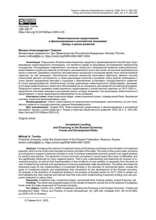 Травкин, М.А. Инвестиционное кредитование и финансирование в российской экономике: тренды и риски развития // Теория и практика общественного развития. – 2025. – № 4. — С. 229-236. — Только в электронном виде. — <URL:http://elib.fa.ru/art2025/bv698.pdf>.