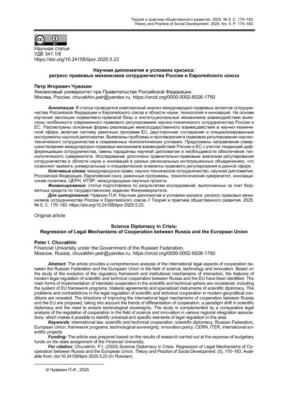 Чувахин, П.И. Научная дипломатия в условиях кризиса: регресс правовых механизмов сотрудничества России и Европейского союза // Теория и практика общественного развития. – 2025. – № 5. — С. 175-183. — Только в электронном виде. — <URL:http://elib.fa.ru/art2025/bv701.pdf>.