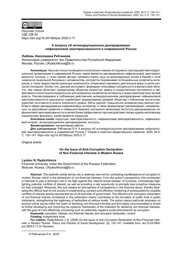 Рябчикова, Л.Н. К вопросу об антикоррупционном декларировании нефинансовой заинтересованности в современной России // Теория и практика общественного развития. – 2025. – № 5. — С. 135-141. — Только в электронном виде. — <URL:http://elib.fa.ru/art2025/bv702.pdf>.