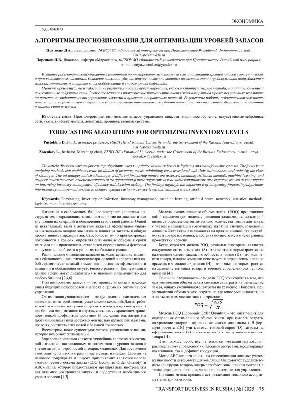 Пустохин, Д.А. Алгоритмы прогнозирования для оптимизации уровней запасов / Д.А. Пустохин, Л.В. Зоренков // Транспортное дело России. – 2025. – № 1. — С. 75-77. — Только в электронном виде. — <URL:http://elib.fa.ru/art2025/bv703.pdf>.