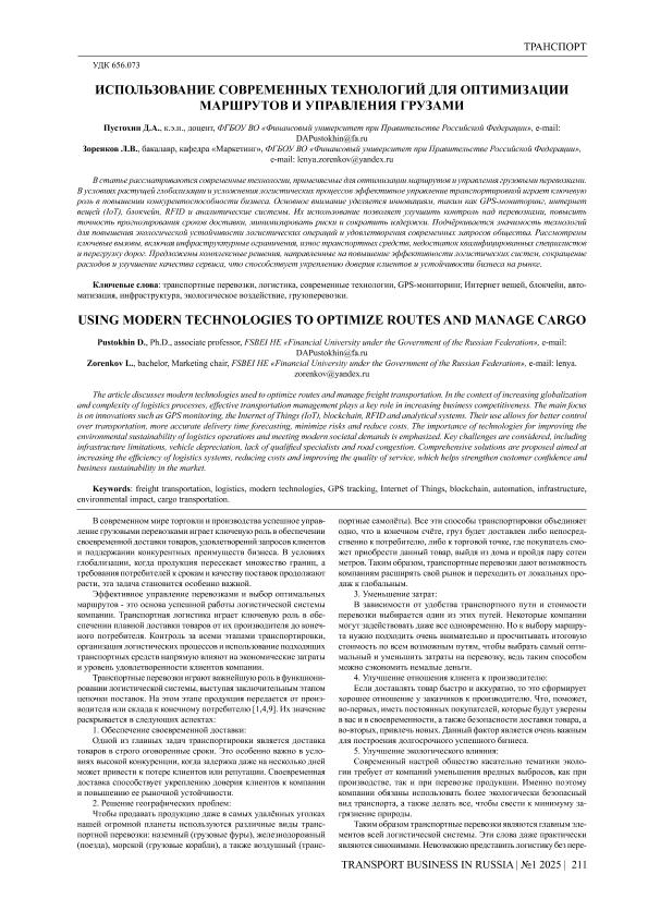 Пустохин, Д.А. Использование современных технологий для оптимизации маршрутов и управления грузами / Д.А. Пустохин, Л.В. Зоренков // Транспортное дело России. – 2025. – № 1. — С. 211-213. — Только в электронном виде. — <URL:http://elib.fa.ru/art2025/bv704.pdf>.