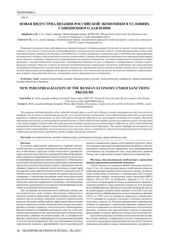 Щербаков, А.П. Новая индустриализация российской экономики в условиях санкционного давления / А.П. Щербаков, С.П. Свистун // Транспортное дело России. – 2025. – № 2. — С. 30-33. — Только в электронном виде. — <URL:http://elib.fa.ru/art2025/bv705.pdf>.