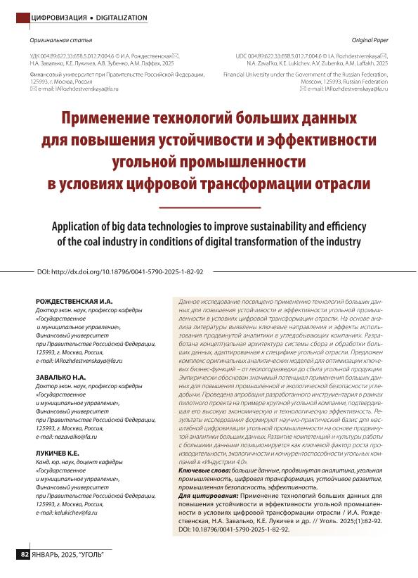 Применение технологий больших данных для повышения устойчивости и эффективности угольной промышленности в условиях цифровой трансформации отрасли / И.А. Рождественская, Н.А. Завалько, К.Е. Лукичев [и др.] // Уголь. – 2025. – № 1. — С. 82-92. — Только в электронном виде. — <URL:http://elib.fa.ru/art2025/bv706.pdf>.