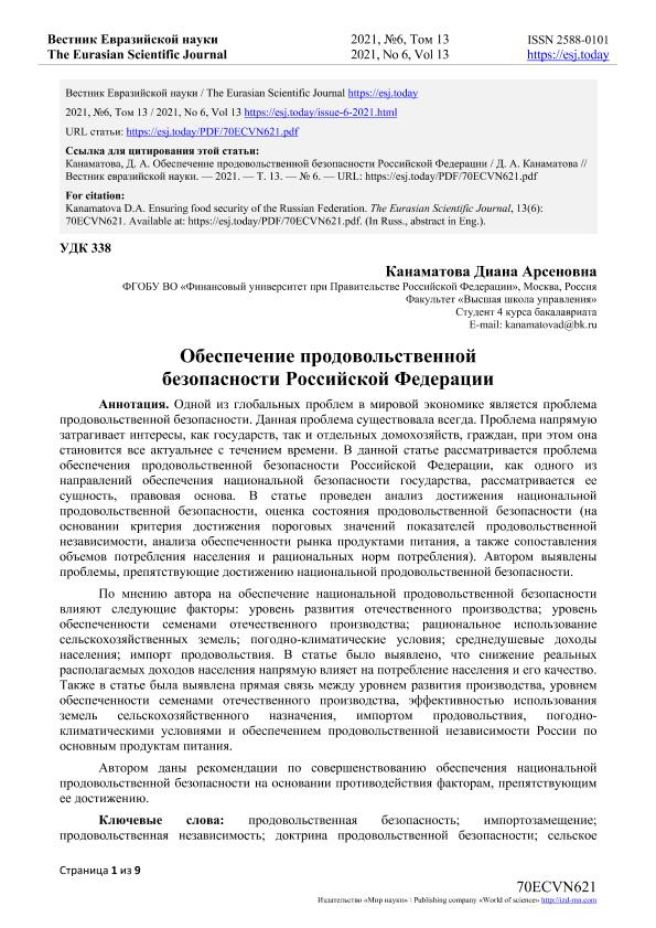 Канаматова Д.А. Обеспечение продовольственной безопасности Российской Федерации. — Текст: электронный // Вестник Евразийской науки. – 2021. – № 6.- URL: https://esj.today/PDF/70ECVN621.pdf (дата обращения: 07.10.2022) — <URL:http://elib.fa.ru/art2021/bv3532.pdf>.