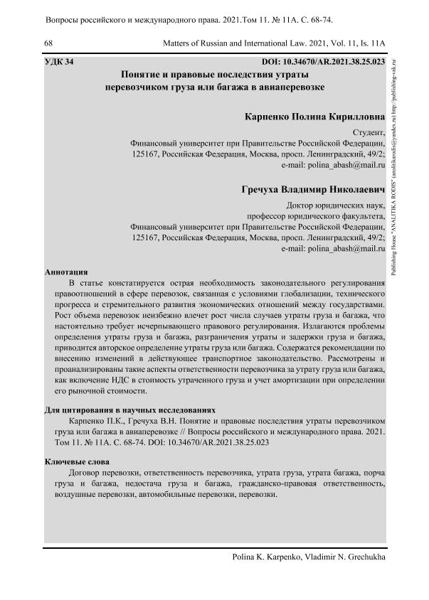 Карпенко П.К. Понятие и правовые последствия утраты перевозчиком груза или багажа в авиаперевозке / Карпенко П.К., Гречуха В.Н. // Вопросы российского и международного права. – 2021. – № 11А.- С.68-74. — Только в электронном виде. — <URL:http://elib.fa.ru/art2021/bv3533.pdf>.