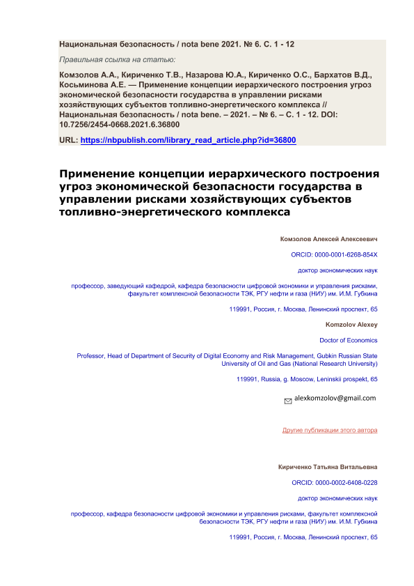 Применение концепции иерархического построения угроз экономической безопасности государства в управлении рисками хозяйствующих субъектов топливно-энергетического комплекса / Комзолов А.А., Кириченко Т.В., Назарова Ю.А. [и др.]. — Текст: электронный // Национальная безопасность. – 2021. – № 6.-С.1-12.- URL: https://nbpublish.com/library_read_article.php?id=36800.- Дата публикации: 11.11.2021 — <URL:http://elib.fa.ru/art2021/bv3534.pdf>.