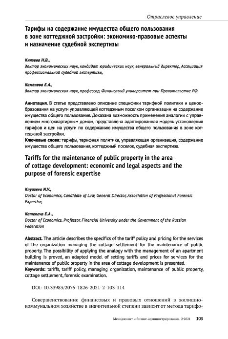 Князева Н.В. Тарифы на содержание имущества общего пользования в зоне коттеджной застройки: экономико-правовые аспекты и назначение судебной экспертизы / Князева Н.В., Каменева Е.А. // Менеджмент и бизнес-администрирование. – 2021. – № 3.-С.103-114. — Только в электронном виде. — <URL:http://elib.fa.ru/art2021/bv3535.pdf>.
