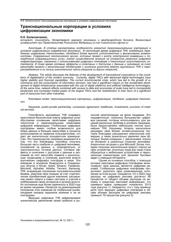 Колесниченко Н.К. Транснациональные корпорации в условиях цифровизации экономики // Экономика и предпринимательство. – 2021. – № 12.-С.125-127. — Только в электронном виде. — <URL:http://elib.fa.ru/art2021/bv3536.pdf>.