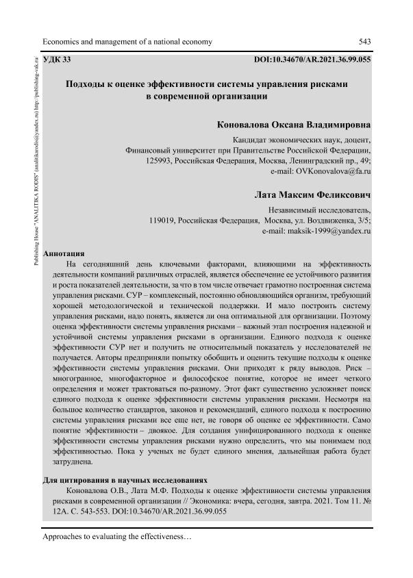 Коновалова О.В. Подходы к оценке эффективности системы управления рисками в современной организации / Коновалова О.В., Лата М.Ф. // Экономика: вчера, сегодня, завтра. – 2021. – № 12А.-С.543-553. — Только в электронном виде. — <URL:http://elib.fa.ru/art2021/bv3537.pdf>.