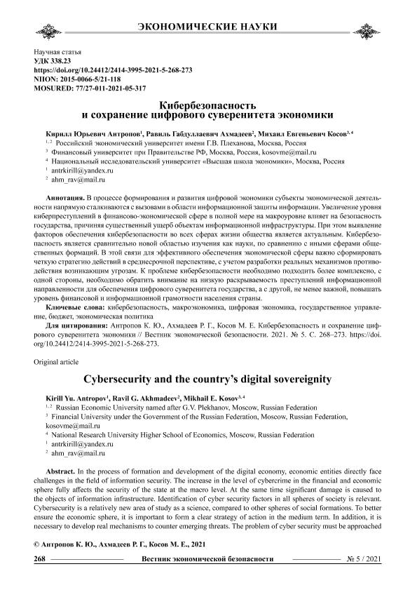 Антропов К.Ю. Кибербезопасность и сохранение цифрового суверенитета экономики / Антропов К.Ю., Ахмадеев Р.Г., Косов М.Е. // Вестник экономической безопасности. – 2021. – № 5.- С.268-273. — Только в электронном виде. — <URL:http://elib.fa.ru/art2021/bv3538.pdf>.