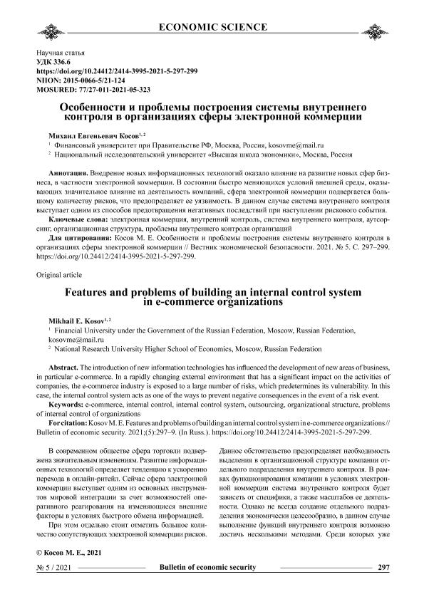 Косов М.Е. Особенности и проблемы построения системы внутреннего контроля в организациях сферы электронной коммерции // Вестник экономической безопасности. – 2021. – № 5.- С.297-299. — Только в электронном виде. — <URL:http://elib.fa.ru/art2021/bv3539.pdf>.