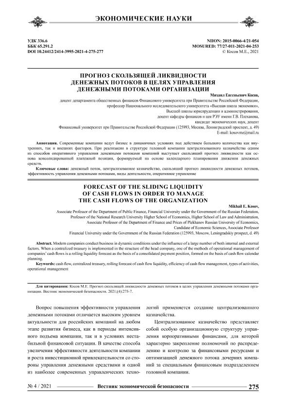 Косов М.Е. Прогноз скользящей ликвидности денежных потоков в целях управления денежными потоками организации // Вестник экономической безопасности. – 2021. – № 4.- С.275-277. — Только в электронном виде. — <URL:http://elib.fa.ru/art2021/bv3540.pdf>.